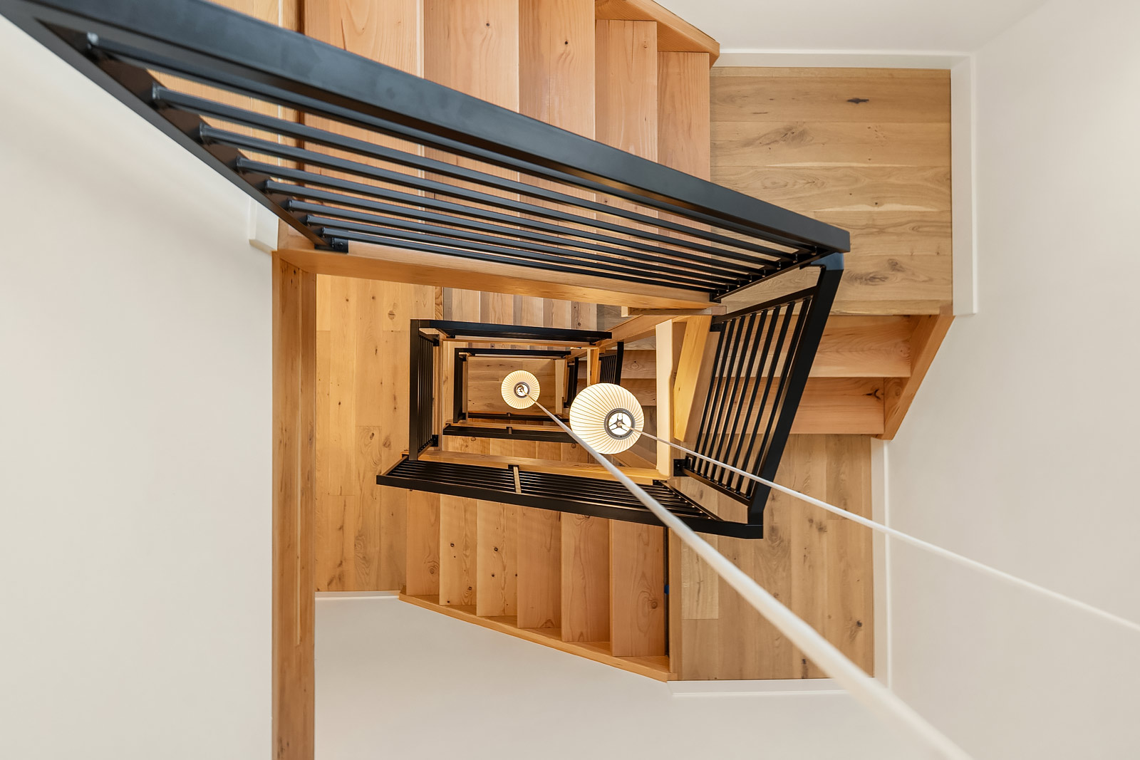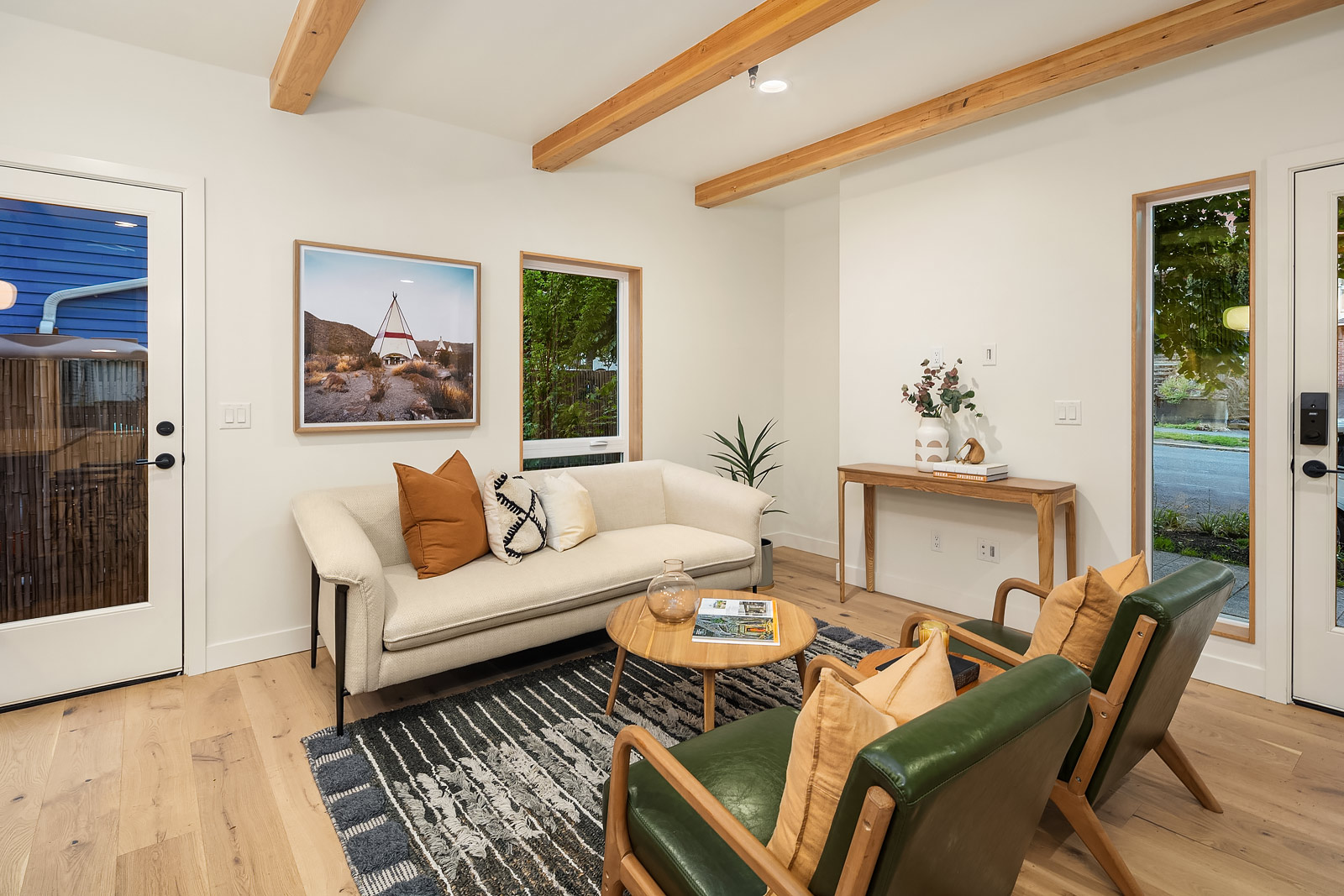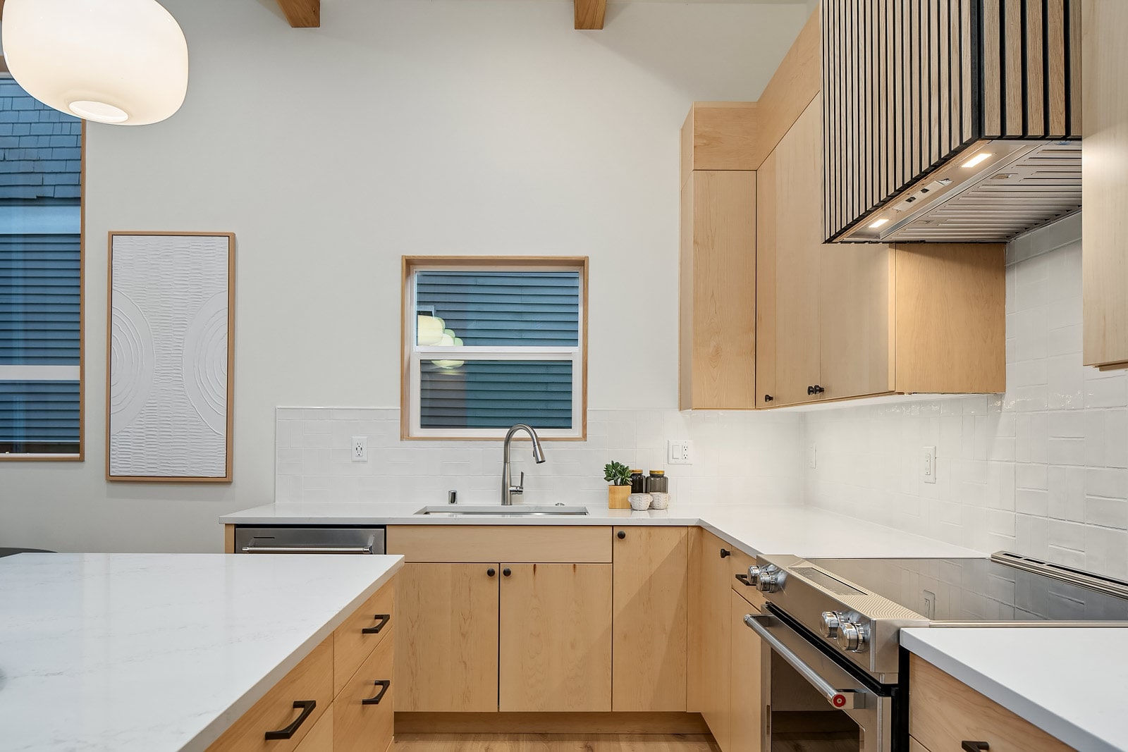 Inside, the homes are filled with natural light from expansive windows and are enhanced by soaring ceilings, custom finishes, and high-end appliances. Key design elements include wide hardwood floors, exposed wood beams, and a walk-in laundry room with a sink.